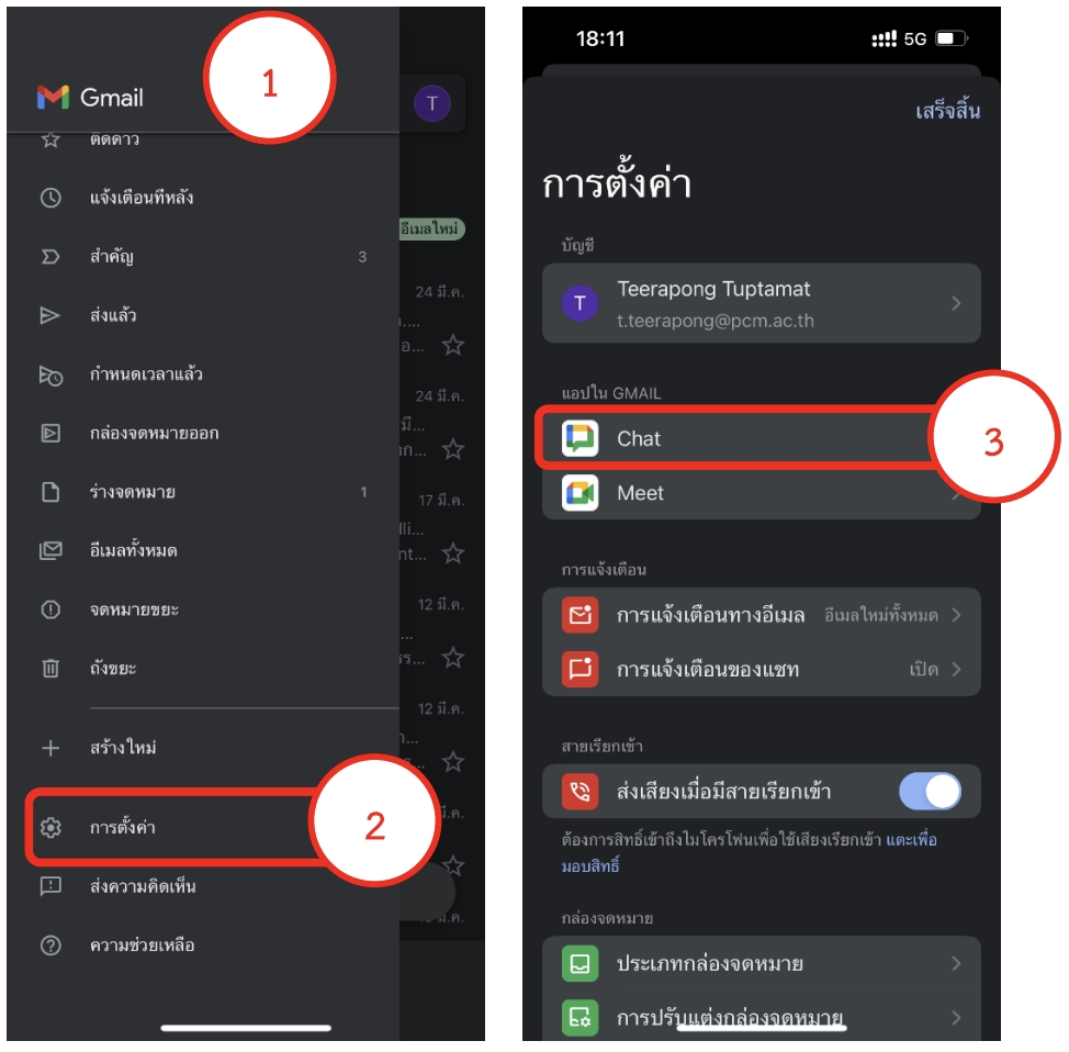 คุณจะต้องลงชื่อเข้าใช้งานด้วยบัญชี @pcm.ac.th ในแอปพลิเคชัน Gmail ก่อน